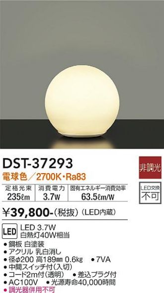 DST-37293商品詳細 DAIKO(大光電機)スタンド DST-37293スタンド メーカーホームページはこちらから DST-37293 メーカー標準価格 ¥39,800(税込 ¥43,780) 販売価格 ¥14,248 (税込 ¥15,672) 数量 LED LED 3.7W 電球色/2700K鋼板 白塗装アクリル 乳白消し径φ200 高189mm0.6kg●中間スイッチ付(入切)●コード2m付(透明)●差込プラグ付●AC100V●光束維持時間40,000時間●調光器併用不可●7VA定格光束 235 lm消費電力 3.7 W固有エネルギー消費効率 63.5 lm/WRa83白熱灯40W相当 商品一覧に戻る 最近チェックした商品 FY-NSX30 TG-382 FY-MFA033 商品一覧に戻る