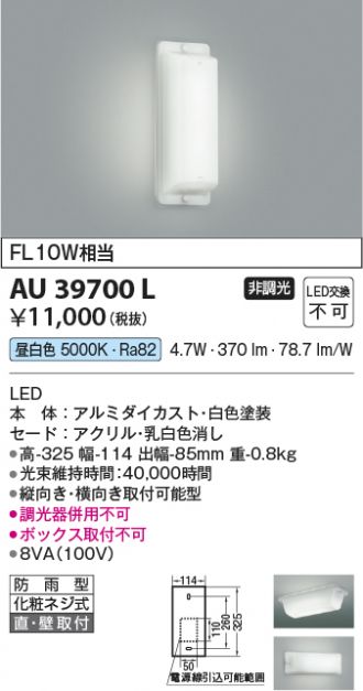 AU39700L商品詳細 KOIZUMI(コイズミ照明)ブラケット AU39700LLED防雨型ブラケット メーカーホームページはこちらから AU39700L メーカー標準価格 ¥11,000(税込 ¥12,100) 販売価格 ¥4,103 (税込 ¥4,513) 数量 LED 工事必要 LED(昼白色)FL10W相当LED本体:アルミダイカスト・白色塗装セード:アクリル・乳白色消し●高-325 幅-114 出幅-85mm 重-0.8kg●消費電力:4.7W●定格光束:370 lm●固有エネルギー消費効率:78.7 lm/W●演色性:Ra82●色温度:5000K●光束維持時間:40,000時間●縦向き・横向き取付可能型●調光器併用不可●ボックス取付不可●8VA(100V) 商品一覧に戻る