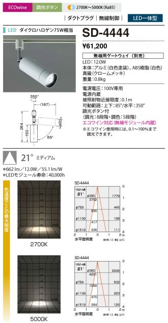 SD-4444商品詳細 YAMADA(山田照明)スポットライト SD-4444スポットライト メーカーホームページはこちらから SD-4444 オープンプライス お問い合わせ下さい メーカー価格改定の為、商品画像に旧価格が表示されている場合があります。ご了承ください。 数量 LED ダクトレール用 取付方法:ダクトタイプ配光角度:21°光色(LED):調色色温度(K):2700K~5000K演色性(Ra):Ra85LEDタイプ:LED一体型従来光源相当:ダイクロハロゲン75W相当調光:ボリューム・スイッチ光源仕様:LED 12.0W寸法:幅φ60mm・長181mm・高259mm重量:0.8kg材質仕上:本体:アルミ(白色塗装)・ABS樹脂(白色)・真鍮(クロームメッキ)電圧:100V専用定格光束(LED):822lm消費電力(LED):12W固有エネルギー消費効率(LED):68.5lm/WLEDモジュール寿命:40000シリーズ名:Mor SPOT(モル・スポット)コメント:ボタン1つで明るさと色温度をコンロール。明るさと色温度を器具上部のボタン1つで操作します。クリックで色温度、長押しで明るさを切り替える動作は、脚立に登って手探りで行う事の多いスポットライト調整でも戸惑いを感じさせません。ECOwie(エコワイン)対応。特徴1:電源電圧100V専用特徴2:電源内蔵特徴3:被照射物近接限度0.1m特徴4:可動範囲(上下:90°/水平:350°)特徴5:調光スイッチ付(調光:8段階/調色:5段階)特徴6:エコワイン対応(無線モジュール内蔵)※エコワイン使用時には、0.1~100%まで調光できます。特徴7:2700K~5000K Ra85 商品一覧に戻る 最近チェックした商品 ERX2149040 FW-50VP OL251816WR DDL-5578YB OL291406R 商品一覧に戻る