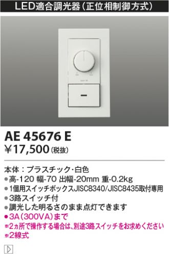 AE45676E商品詳細 KOIZUMI(コイズミ照明)オプション AE45676Eライトコントローラ メーカーホームページはこちらから AE45676E メーカー標準価格 ¥17,500(税込 ¥19,250) 販売価格 ¥6,527 (税込 ¥7,179) 数量 工事必要 本体:プラスチック・白色●高-120 幅-70 出幅-20mm 重-0.2kg●1個用スイッチボックスJISC8340/JISC8435取付専用●3路スイッチ付●調光した明るさのまま点灯できます●3A(300VA)まで※2ヵ所で操作する場合は、別途3路スイッチをお求めください※2線式 商品一覧に戻る 最近チェックした商品 LEKT40752... XAS7300LCE1 RX406ND XNW0661WWLE9 OS256627R LGWC85064U LZD-9035FWB4 XLX461FDN... WTT51421A1 DBL-5718YBG ERX9662S LZS-93118ABW XLX450VDN... V-904KQE9 OP252603NR 商品一覧に戻る