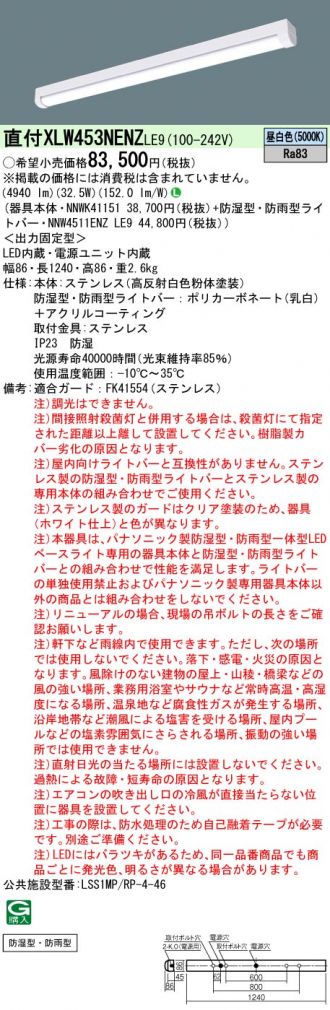 天井直付型 40形 一体型LEDベースライト ステンレス製 防湿型・防雨型 iスタイル/ストレートタイプ/笠なし型(NNWK41151+NNW4511ENZLE9)(iDシリーズ)