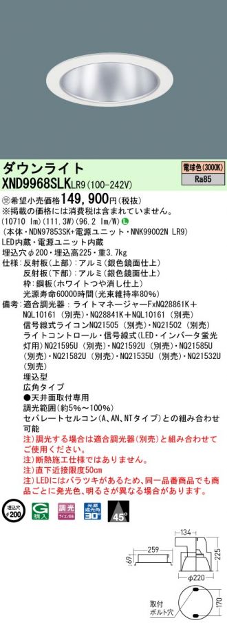 天井埋込型 LED(電球色) ダウンライト ビーム角45度・広角タイプ・光源遮光角30度 調光タイプ(ライコン別売)/埋込穴φ200 HID300形1灯器具相当 LED 1500形(NDN97853SK+NNK99002NLR9)
