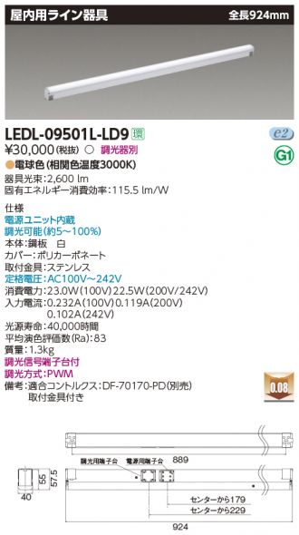 LEDL-09501L-LD9商品詳細 TOSHIBA(東芝ライテック)間接照明 LEDL-09501L-LD9屋内用器具ライン器具調光L色 メーカーホームページはこちらから LEDL-09501L-LD9 メーカー標準価格 ¥34,500(税込 ¥37,950) 販売価格 ¥13,110 (税込 ¥14,421) メーカー価格改定の為、商品画像に旧価格が表示されている場合があります。ご了承ください。 数量 LED 工事必要 カテゴリ情報 屋内用ライン器具定格電圧 100V~242V器具幅 W:40 mm質量 1.3 kg調光方式 PWM制御調光範囲 約5%~100%光色(相関色温度、平均演色評価数) 電球色(3000K Ra:80)器具光束 2600 lm消費電力 23.0W(100V) 22.5W(200V) 22.5W(242V)入力電流 232mA(100V) 119mA(200V) 102mA(242V)エネルギー消費効率 115.5lm/W(200V)周波数 50/60Hz付加機能 調光タイプHZ適合 50/60Hz仕様1名称 本体仕様1材質 鋼板仕様1仕上げ 白仕様2名称 カバー仕様2材質 ポリカーボネイト仕様3名称 取付金具仕様3材質 ステンレス始動電圧 LD9補助点灯装置 電源ユニット内蔵 調光可能形(約5~100%) 調光器別その他備考 調光信号用端子台付その他備考 調光方式:PWMその他備考 適合コントルクス:DF-70170-PD(別売)その他備考 取付金具付きその他備考 照射面距離:0.08 商品一覧に戻る