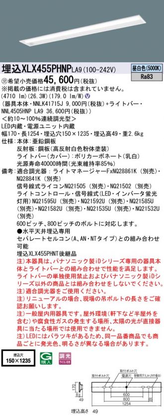 天井埋込型 40形 一体型LEDベースライト 連続調光型・調光タイプ(ライコン別売) コンフォート/下面開放型 Hf蛍光灯32形定格出力型2灯器具相当/Hf蛍光灯63形定格出力型1灯器具相当 Hf32形定格出力型/Hf63形定格出力型・5200 lm(iDシリーズ)(NNLK41715J+NNL4505HNPLA9)