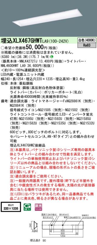 学校用 天井埋込型 40形 一体型LEDベースライト 連続調光型・調光タイプ(ライコン別売) スクールコンフォート Hf蛍光灯32形高出力型2灯器具相当 Hf32形高出力型・6900 lm(iDシリーズ)(NNLK42727J+NNL4600HWTLA9)