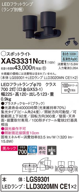 天井直付型・壁直付型・据置取付型 LED(昼白色) スポットライト 美ルック・プラスチックセードタイプ・ビーム角24度・集光タイプ 110Vダイクール電球100形2灯器具相当(LGS9301+LLD3020MNCE1x2)