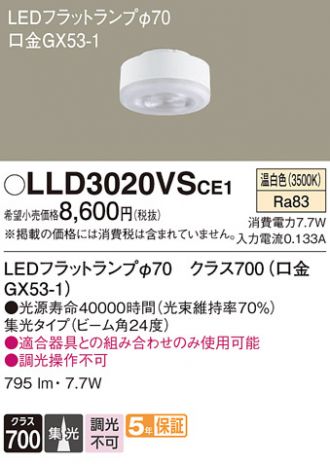 LLD3020VSCE1商品詳細 Panasonic(パナソニック)LED・蛍光灯・電球 LLD3020VSCE1LED(温白色) LEDフラットランプ ビーム角24度・集光タイプ φ70 メーカーホームページはこちらから LLD3020VSCE1 メーカー標準価格 ¥8,600(税込 ¥9,460) 販売価格 ¥2,992 (税込 ¥3,291) 銀行振込ご決済はご利用いただけません。ご決算方法の変更をお願いする場合がございますので予めご了承下さい。 数量 LED その他寸法情報なし本体材質・仕上・色なし 商品一覧に戻る