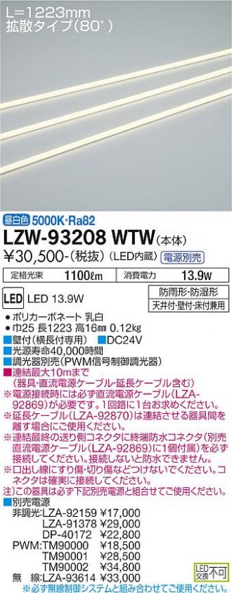 LZW-93208WTW商品詳細 DAIKO(大光電機)イルミネーション LZW-93208WTWアウトドアライン照明 メーカーホームページはこちらから LZW-93208WTW メーカー標準価格 ¥33,500(税込 ¥36,850) 販売価格 ¥16,013 (税込 ¥17,614) 数量 LED 工事必要 L=1223mm拡散タイプ(80°)LED 12W 昼白色/5000K電源別売防雨・防湿形天井付・壁付・床付兼用巾25 長1223 高16mm0.12kg●壁付(横長付専用)●DC24V●光束維持時間40,000時間●調光にはLED専用調光器(別売)をご使用ください。●連結最大10mまで(器具・直流電源ケーブル・延長ケーブル含む)※電源接続時には必ず直流電源ケーブル(DP-40169)が必要です。1回路に1台お求めください。※延長ケーブル(LZA-92870)は連結させる器具間を離す場合にご使用ください。※連結最終の送り側コネクタに終端防水コネクタ(別売直流電源ケーブル(DP-40169)に1個付属)を必ず接続してください。接続しないと防水できません。※口出し線にすり傷・切り傷などつけないでください。コネクタは確実に接続してください。注)この器具は必ず下記別売電源と組合せてご使用ください。●別売電源非調光:DP-42054 DP-42055 DP-42056 LZA-92159 DP-40172無線:LZA-93614 LZA-93801※必ず無線制御システムと組み合わせてご使用ください。PWM:TM90000 TM90001 TM90002IP65定格光束 1100 lm定格消費電力 12 W固有エネルギー消費効率 91.6 lm/WRa82 商品一覧に戻る 最近チェックした商品 WP9171A XD504011R4M XY6811ZLE9 RAD848F LGC41156K XL501042R2A XU057519W... LZD-91495YB AE47336E FA40328CL... WTA85124CS 商品一覧に戻る