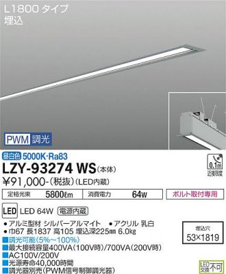 LZY-93274WS商品詳細 DAIKO(大光電機)ベースライト LZY-93274WS埋込ベースライト メーカーホームページはこちらから LZY-93274WS メーカー標準価格 ¥91,000(税込 ¥100,100) 販売価格 ¥43,498 (税込 ¥47,847) この商品は宅配便不可商品につき、以下ご注意ください。●お届け日時のご指定はお受けできません。●平日のみのお届けになります。(土・日曜日および祝日のご指定はお受けできません。)●追加運賃のご連絡をさせていただく場合がございます。●代金引換ご決済でお手続きいただきました場合、銀行振込ご決済に変更させていただきます。予めご了承ください。 数量 LED 工事必要 L=1800mm埋込PWMタイプLED 64W 昼白色/5000Kボルト取付専用巾67 長1837 高105 埋込深225mm6.0kg●調光可能(5%~100%)●最大接続容量400VA(100V時)/700VA(200V時)●AC100V/200V●光束維持時間40,000時間●調光にはLED専用調光器(別売)をご使用ください。定格光束 5800 lm定格消費電力 64 W固有エネルギー消費効率 90.6 lm/WRa83 商品一覧に戻る 最近チェックした商品 LGC51127K XLGB82915CE1 NNL2300EW... LEKR76010... NTS91055W DWP-40865Y XRP6039WB XD057528B... NTS90551RY9 ERP7442BA V-604KQ9 LGB80547LB1 ERD7302W-... LZW-93208WTW WP9171A XD504011R4M XY6811ZLE9 RAD848F LGC41156K XL501042R2A 商品一覧に戻る