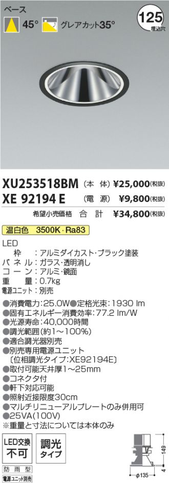 XU253518BM-XE92194E商品詳細 KOIZUMI(コイズミ照明)ダウンライト XU253518BM-XE92194Eダウンライト(XU253518BM+XE92194E) メーカーホームページはこちらから XU253518BM-XE92194E メーカー標準価格 ¥34,900(税込 ¥38,390) 販売価格 ¥16,752 (税込 ¥18,427) メーカー価格改定の為、商品画像に旧価格が表示されている場合があります。ご了承ください。 数量 LED 工事必要 LED枠:アルミダイカスト・ブラック塗装パネル:ガラス・透明消しコーン:アルミ・鏡面LED(温白色)重量:0.7kg電源ユニット:別売●消費電力:25.0WLEDランプ●色温度:3500K●演色性:Ra83●定格光束:1930 lm●固有エネルギー消費効率:77.2 lm/W●光源寿命:40,000時間●調光範囲(約1~100%)●別売専用電源ユニット〔位相調光タイプ:XE92194E〕●取付可能天井厚1~25mm●軒下対応可能●適合調光器別売●マルチリニューアルプレートのみ併用可●コネクタ付●照射近接限度30cm●25VA(100V) 商品一覧に戻る 最近チェックした商品 OX9707LDR ERP7196BB P-3155SHP2-B XLX230MDN... XLX449PEVLA9 WN1476H ERK9876SA ERD6161S-... AL93209 LGB10717KLU1 XLX450VHW... ERD9377B-... ERX2049030 YLD-9029-L VFR-94LJK OP252226LR WNS575830H WTY2401F OP252593NR DDL-6244AWG 商品一覧に戻る