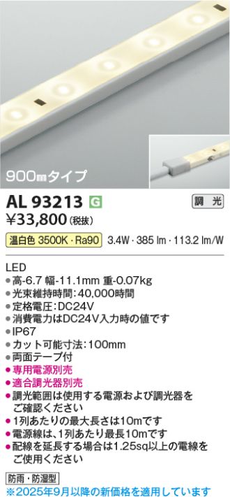 AL93213商品詳細 KOIZUMI(コイズミ照明)イルミネーション AL93213LEDテープライト メーカーホームページはこちらから AL93213 メーカー標準価格 ¥33,800(税込 ¥37,180) 販売価格 ¥12,607 (税込 ¥13,867) 数量 LED 工事必要 LED(温白色)LED●高-6.7 幅-11.1 全長-900 コード長-500mm 重-0.07kg●消費電力:3.4W●定格光束:385 lm●固有エネルギー消費効率:113.2 lm/W●色温度:3500K●光束維持時間:40,000時間●演色性:Ra90●定格電圧:DC24V●消費電力はDC24V入力時の値です●IP67●カット可能寸法:100mm●両面テープ付●専用電源別売●適合調光器別売●調光範囲は使用する電源および調光器をご確認ください●1列あたりの最大長さは10mです●電源線は、1列あたり最長10mです 商品一覧に戻る 最近チェックした商品 OA253279 商品一覧に戻る
