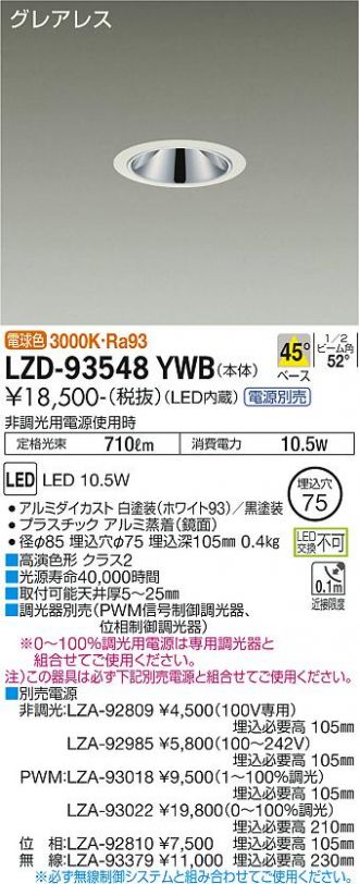 LZD-93548YWB商品詳細 DAIKO(大光電機)ダウンライト LZD-93548YWBダウンライト メーカーホームページはこちらから LZD-93548YWB メーカー標準価格 ¥19,500(税込 ¥21,450) 販売価格 ¥9,321 (税込 ¥10,253) 数量 LED 工事必要 グレアレスLED 10.5W 電球色/3000K電源別売径φ85 埋込穴φ75 埋込深105mm0.4kg●光束維持時間40,000時間●取付可能天井厚5~25mm●調光にはLED専用調光器(別売)をご使用ください。※0~100%調光用電源は専用調光器と組合せてご使用ください。注)この器具は必ず下記別売電源と組合せてご使用ください。●別売電源非調光:LZA-92809 (100V専用)LZA-92985 (100~242V)無線:LZA-93379※必ず無線制御システムと組み合わせてご使用ください。PWM:LZA-93018(1~100%) LZA-93022(0~100%)DALI:LZA-93379 位相:LZA-92810非調光用電源使用時:定格光束 710 lm定格消費電力 10.5 W固有エネルギー消費効率 67.6 lm/WRa93(クラス2)1/2ビーム角 52° 商品一覧に戻る 最近チェックした商品 LZD-93109... XSZB83213CB1 SLB81303 LZD-93631NBN XSZB83117CB1 LZD-93109YWM 商品一覧に戻る