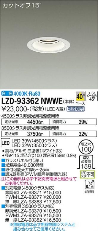 LZD-93362NWWE商品詳細 DAIKO(大光電機)ダウンライト LZD-93362NWWEダウンライト メーカーホームページはこちらから LZD-93362NWWE メーカー標準価格 ¥23,000(税込 ¥25,300) 販売価格 ¥10,994 (税込 ¥12,093) 数量 LED 工事必要 カットオフ15°LED 39W(4500クラス)LED 32W(3500クラス) 白色/4000K電源別売径φ115 埋込穴φ100 埋込深159mm0.9kg●ガラスパネル付(消し)●光束維持時間40,000時間●取付可能天井厚5~25mm●調光にはLED専用調光器(別売)をご使用ください。注)この器具は必ず下記別売電源と組合せてご使用ください。●別売電源(4500クラス対応)非調光:LZA-93371無線:LZA-93383PWM:LZA-93377●別売電源(3500クラス対応)非調光:LZA-93370無線:LZA-93382PWM:LZA-93376※無線電源は必ず無線制御システムと組み合わせてご使用ください。4500クラス非調光用電源使用時:定格光束 4450 lm定格消費電力 39 W固有エネルギー消費効率 114.1 lm/W3500クラス非調光用電源使用時:定格光束 3750 lm定格消費電力 32 W固有エネルギー消費効率 117.1 lm/WRa831/2ビーム角 45° 商品一覧に戻る
