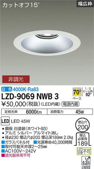 LZD-9069NWB3商品詳細 DAIKO(大光電機)ダウンライト LZD-9069NWB3ダウンライト メーカーホームページはこちらから LZD-9069NWB3 メーカー標準価格 ¥50,000(税込 ¥55,000) 販売価格 ¥23,900 (税込 ¥26,290) 数量 LED 工事必要 受注生産品カットオフ15°幅広枠LED 45W 白色/4000K径φ230 埋込穴φ200 埋込深189mm2.0kg●ガラスパネル付●光束維持時間40,000時間●取付可能天井厚2~25mm●AC100V~242V●調光器併用不可定格光束 6000 lm定格消費電力 45 W固有エネルギー消費効率 133.3 lm/WRa831/2ビーム角 92° 商品一覧に戻る