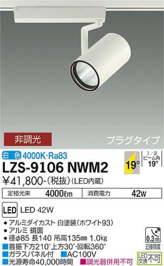 LZS-9106NWM2商品詳細 DAIKO(大光電機)スポットライト LZS-9106NWM2スポットライト メーカーホームページはこちらから LZS-9106NWM2 メーカー標準価格 ¥41,800(税込 ¥45,980) 販売価格 ¥19,980 (税込 ¥21,978) 数量 LED ダクトレール用 受注生産品プラグタイプLED 42W 白色/4000K径φ85 長140 吊高135mm1.0kg●首振下方210°上方30°・回転360°●ガラスパネル付●AC100V●光束維持時間40,000時間●調光器併用不可定格光束 4050 lm定格消費電力 42 W固有エネルギー消費効率 96.4 lm/WRa831/2ビーム角 20° 商品一覧に戻る