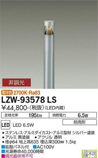 LZW-93578LS商品詳細 DAIKO(大光電機)エクステリア LZW-93578LSアウトドアローポール メーカーホームページはこちらから LZW-93578LS メーカー標準価格 ¥44,800(税込 ¥49,280) 販売価格 ¥21,414 (税込 ¥23,555) 数量 LED 工事必要 LED 6.5W 電球色/2700K防雨形径φ64 地上高635 埋込深300mm1.5kg●拡散パネル付●AC100V●光束維持時間40,000時間●調光器併用不可定格光束 195 lm定格消費電力 6.5 W固有エネルギー消費効率 30.0 lm/WRa83 商品一覧に戻る 最近チェックした商品 XD007031W... XD154508W... DVF-14MRKQ8 商品一覧に戻る