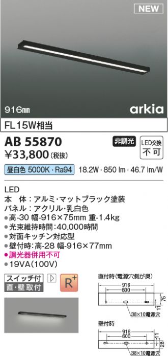 AB55870商品詳細 KOIZUMI(コイズミ照明)キッチンライト AB55870LEDキッチンライト メーカーホームページはこちらから AB55870 メーカー標準価格 ¥34,800(税込 ¥38,280) 販売価格 ¥12,980 (税込 ¥14,278) 数量 LED 工事必要 LED(昼白色)FL15W相当LED本体:アルミ・マットブラック塗装パネル:アクリル・乳白色●高-30 幅-916×75mm 重-1.4kg●消費電力:18.2W●定格光束:850 lm●固有エネルギー消費効率:46.7 lm/W●演色性:Ra94●色温度:5000K●光束維持時間:40,000時間●対面キッチン対応型●壁付時:高-28 幅-916×77mm●調光器併用不可●傾斜天井使用不可●19VA(100V) 商品一覧に戻る 最近チェックした商品 NF-15S 商品一覧に戻る