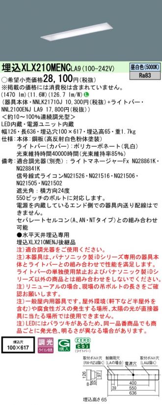 天井埋込型 20形 一体型LEDベースライト 連続調光型調光タイプ(ライコン別売) コンフォート15/下面開放型 Hf蛍光灯16形高出力型1灯器具相当 Hf16形高出力型・1600 lm(NNLK21710J+NNL2100ENJLA9)