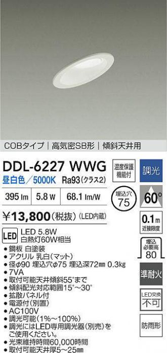 DDL-6227WWG商品詳細 DAIKO(大光電機)ダウンライト DDL-6227WWGダウンライト メーカーホームページはこちらから DDL-6227WWG メーカー標準価格 ¥13,800(税込 ¥15,180) 販売価格 ¥4,940 (税込 ¥5,434) 数量 LED 工事必要 LED 5.8W 昼白色/5000K鋼板 白塗装アクリル 乳白(マット)径φ90 埋込穴φ75 埋込深72mm0.3kg●取付可能天井傾斜55°まで●傾斜配光対応範囲15°~30°●拡散パネル付●電源付(別置)●AC100V●調光可能(1%~100%)●調光にはLED専用調光器(別売)をご使用ください。●光束維持時間60,000時間●取付可能天井厚5~25mm●7VA定格光束 395 lm消費電力 5.8 W固有エネルギー消費効率 68.1 lm/WRa93(クラス2)白熱灯60W相当 商品一覧に戻る 最近チェックした商品 XD93316-X... 商品一覧に戻る