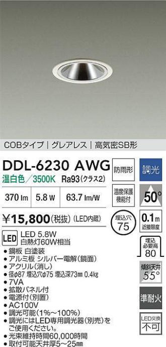 DDL-6230AWG商品詳細 DAIKO(大光電機)ダウンライト DDL-6230AWGダウンライト メーカーホームページはこちらから DDL-6230AWG メーカー標準価格 ¥15,800(税込 ¥17,380) 販売価格 ¥5,656 (税込 ¥6,221) 数量 LED 工事必要 LED 5.8W 温白色/3500K鋼板 白塗装アルミ板 シルバー電解(鏡面)アクリル(消し)径φ87 埋込穴φ75 埋込深73mm0.4kg●拡散パネル付●電源付(別置)●AC100V●調光可能(1%~100%)●調光にはLED専用調光器(別売)をご使用ください。●光束維持時間60,000時間●取付可能天井厚5~25mm●7VA定格光束 370 lm消費電力 5.8 W固有エネルギー消費効率 63.7 lm/WRa93(クラス2)白熱灯60W相当傾斜天井にも使用可能(55°まで) 商品一覧に戻る 最近チェックした商品 DDL-6229ABG 商品一覧に戻る