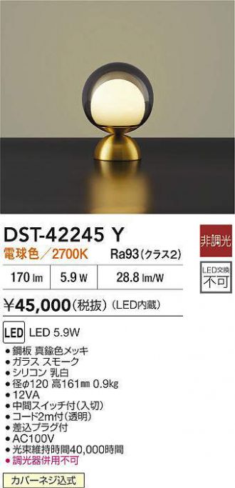 DST-42245Y商品詳細 DAIKO(大光電機)スタンド DST-42245Yスタンド メーカーホームページはこちらから DST-42245Y メーカー標準価格 ¥45,000(税込 ¥49,500) 販売価格 ¥16,110 (税込 ¥17,721) 数量 LED LED 5.9W 電球色/2700K鋼板 真鍮色メッキガラス スモークシリコン 乳白径φ120 高161mm0.9kg●中間スイッチ付(入切)●コード2m付(透明)●差込プラグ付●AC100V●光束維持時間40,000時間●調光器併用不可●12VA定格光束 170 lm消費電力 5.9 W固有エネルギー消費効率 28.8 lm/WRa93(クラス2) 商品一覧に戻る 最近チェックした商品 XND1009WNLE9 商品一覧に戻る